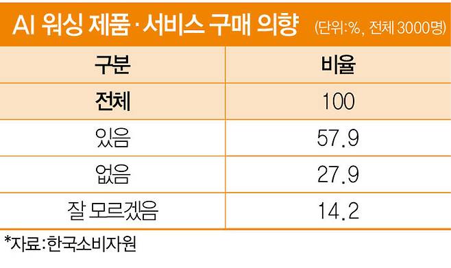 한국소비자원은 지난해 7월 AI가 무엇인지 알고 있는 소비자 3000명을 대상으로 AI 워싱 인식 및 소비행태 조사를 실시했다. AI 제품에 대한 표시·광고가 소비자의 구매 선택에 어떠한 영향을 미치는지 파악하기 위해서다. 그 결과, 응답자의 절반이 넘는 1737명(57.9%)은 “AI 기술이 적용된 제품이 일반 제품보다 비싸더라도 구매할 의향이 있다”고 응답했다. 추가 비용 부담 의향이 있는 가격 인상분은 평균 20.9%에 달했다. 일반 제품·서비스가 10만원이라면 AI 제품·서비스로 인식됐을 때 평균 12만1000원까지 지불할 의사가 있다는 얘기다.