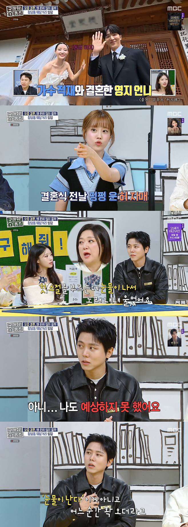 허영지는 지난해 친언니가 결혼했다면서 "전날 너무 많이 울어서 눈이 부은 채로 결혼식에 갔다"라고 말했다. MC 김숙은 "이렇게 자매 결혼식 때 우는 건 봤지만 형제 결혼식 때 우는 건 처음 봤다"라며 주우재를 바라봤다.