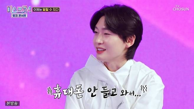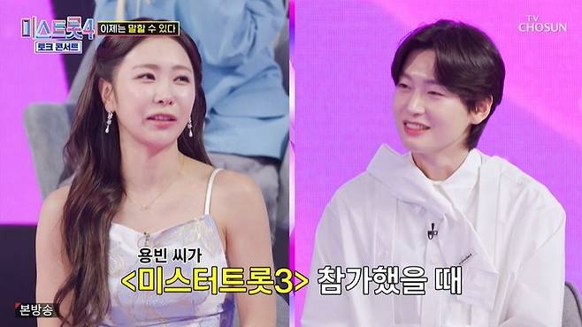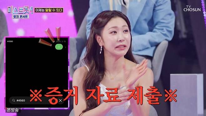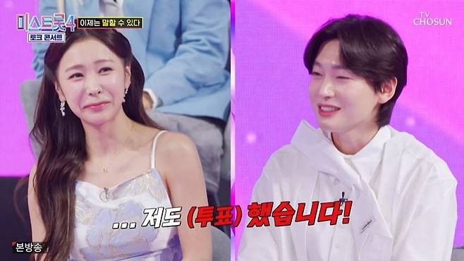 이날 '미스트롯4' 출연자들은 경연 당시 마스터들에게 못했던 말을 꺼냈다. 먼저 허찬미는 김용빈에게 "제가 용빈 씨와 친구다. 지난 시즌에 용빈 씨가 참가했을 때 열심히 응원했다. 대국민 응원 투표도 매일 하고, 결승전 문자 투표도 했다"라고 증거 자료를 보여주면서 김용빈은 누구에게 투표했는지 질문했다.
