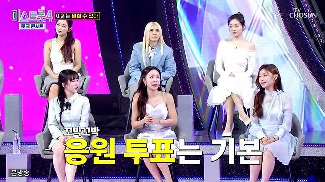 9일 방송된 TV조선 '미스트롯4 토크 콘서트'에서는 MC 김성주, 장윤정과 이소나, 허찬미, 려원, 유미 등이 출연했다.