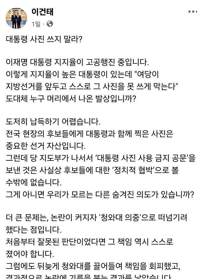 이건태 의원도 SNS 글에서 "도대체 누구 머리에서 나온 발상이냐"며 당 지도부의 판단력을 비난했다. 이 의원은 "지지율 고공행진 중인 대통령의 사진을 못 쓰게 막는 것은 후보들에 대한 '정치적 협박'"이라며 "잘못된 판단의 책임을 청와대로 떠넘기려 한 것은 국민 신뢰를 저버리는 행위"라고 성토했다.
