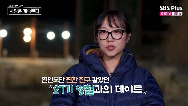 그런 가운데 27기 영철은 17기 순자의 선택으로 처음으로 데이트를 나가게 됐다. 처음 선택받은 영철은 고마운 마음을 전했지만, 순자는 인터뷰에서 "대화하는 것도 편하고 좋았는데, 친구 같았다. 20기 영식 님과 아침에 얘기했을 땐 제가 부끄러워했는데, 이성적 끌림이 강해서 부끄러워했단 걸 확실하게 느꼈다"라고 밝혔다.
