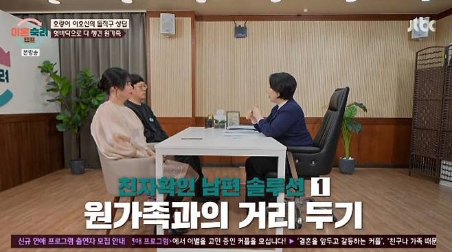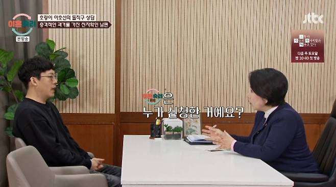 이호선은 아내에 대해 “에너지가 많기 때문에 의심도 많았던 것 같다. 내 생각이 상상이 되고 상상이 망상이 됐다. 우리가 망상이라고 말하지만 아내 입장에선 고통이라 부를 수 있다. 7년이 70년 같았을 것”이라고 말했고 아내는 상담가의 위로에 눈물을 보였다.