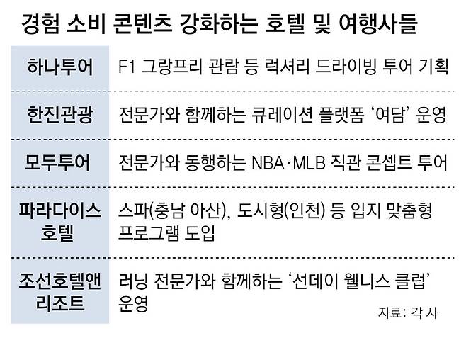 패키지 상품 이용객 감소로 고민이 큰 여행사들도 콘텐츠 경험 중심의 투어 프로그램들을 개발하고 있다. 하나투어는 럭셔리 드라이빙 투어와 세계 최고 레벨의 자동차 경주대회 포뮬러원(F1) 관람권을 활용한 단독 기획 상품 개발에 나섰다. 이를 위해 럭셔리 자동차 테마 여행 기업인 ‘피피티투어’의 지분을 16% 확보했다.