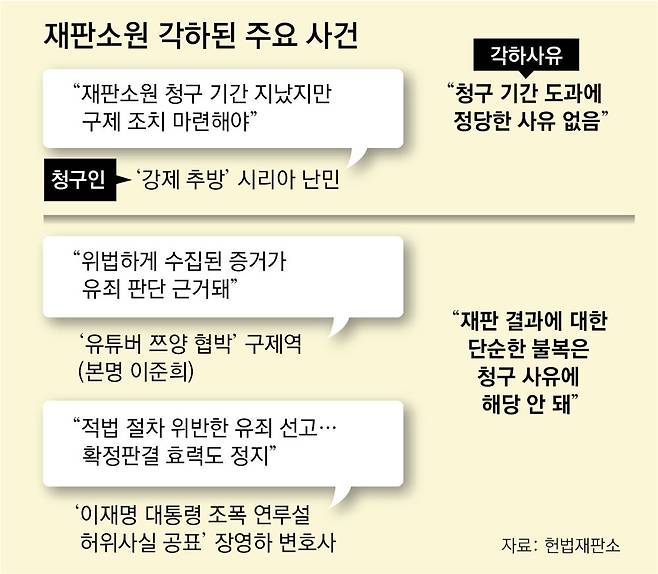 이 과정에서 헌재는 “단순한 재판 불복은 재판소원의 청구 사유가 아니다”라는 등 엄격한 기준을 적용했다. 이재명 대통령의 ‘조폭 연루설’을 주장한 장영하 변호사, 유튜버 쯔양을 협박한 구제역(본명 이준희)이 낸 재판소원이 대표적이다. 이들은 각각 징역형 집행유예, 징역 3년이 확정됐고 이후 재판소원을 청구했다.