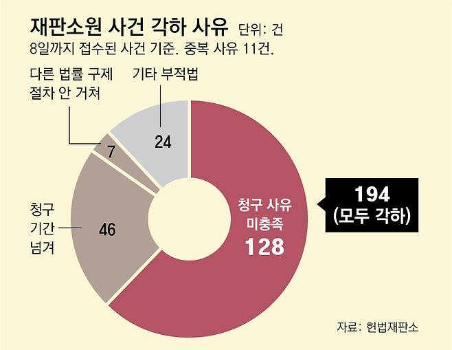 두 사건을 모두 각하한 헌재는 “재판소원은 비상적 성격을 가지는 기본권 보호 제도”라고 결정문에 못 박았다. 개인의 권리 구제 차원을 넘어 헌법적 의미가 있는 사건이어야 재판소원 청구 대상이라는 걸 분명히 한 것. 헌재는 “재판 결과에 대한 단순한 불복에 불과한 경우는 재판소원 청구 사유에 해당되지 않는다”고 밝혔다. 194건 중 절반이 넘는 128건(66%)이 청구 사유를 충족하지 않았다는 이유로 각하됐다.