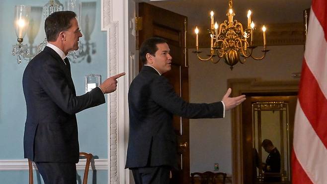 | 중동 전쟁 속 워싱턴 찾아간 나토 사무총장 8일 미국 워싱턴 국무부 청사에서 마코 루비오 미 국무장관(오른쪽)과 마르크 뤼터 북대서양조약기구(NATO) 사무총장이 대화하고 있다. 두 사람은 이날 이란 전쟁에 따른 국제 정세 불안, 나토 동맹 차원의 대응 방안 등을 논의한 것으로 알려졌다. 워싱턴=AP 뉴시스 |