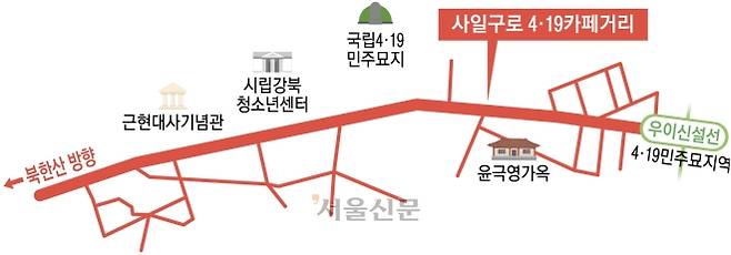 국립 4·19민주묘지 아래편에 ‘사일구로’가 있다. 이 이름이 붙기 전 주민들이 부르던 별칭인 ‘4·19카페거리’ 상권의 역사성과 지역성을 반영해 주민들이 직접 뽑은 이름이다. 도로명 주소인 ‘4·19로’와 발음이 같아 친숙하면서 북한산의 자연과 어우러진 도심 속 쉼표 같은 거리를 뜻한다.