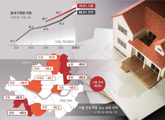 9일 국토교통부의 ‘2026년 2월 주택 통계’에 따르면 올해 1·2월 전국 임대차 시장의 월세 비중은 68.3%를 기록했다. 2022년 47.1%, 2023년 52.4%, 2024년 57.5%, 지난해 61.4%에 이어 5년 연속 상승한 것이고 역대 최고 수준이다. 2월 한 달만 보면 전세 거래량(7만 6308건)은 전년 대비 26%나 줄었다. 서울의 경우 1·2월 월세 비중은 70.2%였다.
