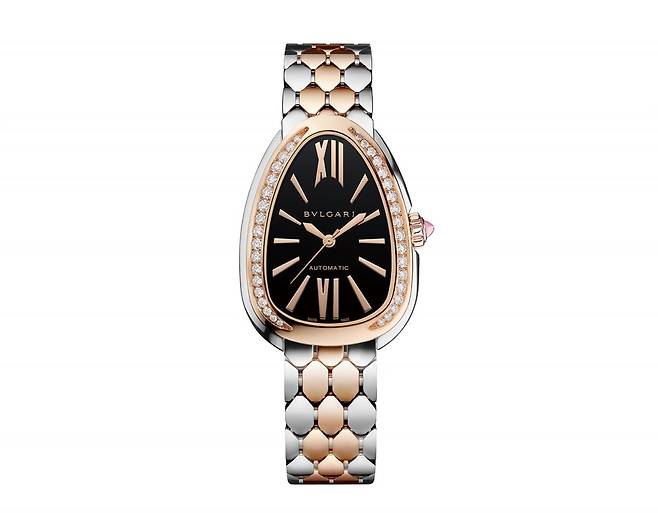 불가리, 세르펜티 세두토리 오토매틱 워치 | 특유의 육각형 스케일 브레이슬릿이 마치 두 번째 피부처럼 손목을 감싸며, 유연하면서도 관능적인 카리스마를 발산한다. 스틸 케이스의 실루엣은 더욱 정교하게 다듬어졌다. 매끄럽게 흐르는 곡선은 여성스러운 우아함을 극대화하며, 카보숑 컷 핑크 루벨라이트가 세팅된 로즈 골드 크라운은 손끝에 전해지는 섬세한 촉각적 경험까지 완성한다. 매끈한 블랙 래커 다이얼과 함께 베젤에는 브릴리언트 컷 다이아몬드 38개를 세팅해 한층 찬란한 빛을 더한다.