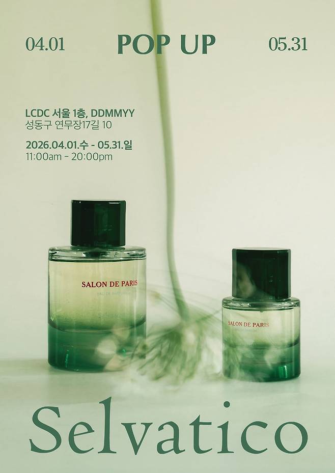 셀바티코, 성수 LCDC 서울 팝업스토어 | 셀바티코가 4월 1일부터 5월 31일까지 성수동 복합문화공간 LCDC 서울 1층 ‘DDMMYY’에서 팝업스토어를 개최한다. 특히 향수와 보디 케어를 함께 사용하는 ‘레이어링 루틴’을 제안한다. 핸드 앤 보디워시와 핸드 앤 보디크림, 오 드 퍼퓸을 한 가지 향으로 통일해 향의 밀도를 쌓거나, 서로 다른 향을 조합해 자신만의 시그니처를 완성하는 등 다양한 조합을 직접 체험할 수 있으며, 개인의 취향에 맞춘 레이어링을 제안하는 도슨트 서비스도 준비돼 있다.