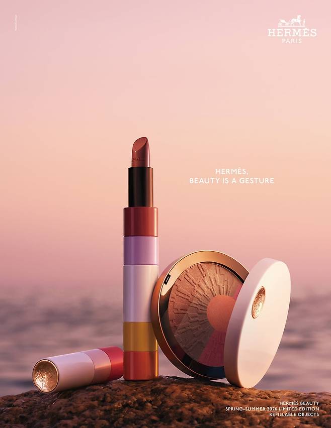 에르메스 뷰티, 2026 S/S 리미티드 컬렉션 | 여름의 열기 속에서 피어난 지중해 석양의 아름다움을 담은 ‘2026 S/S 리미티드 컬렉션’은 헬시 글로우 파우더, 새틴 립스틱, 립 케어 오일, 그리고 에나멜 매니큐어까지 총 네 가지 카테고리를 선보인다. 에르메스 뷰티 크리에이터 디렉터 그레고리스 피르필리스는 이번 컬렉션을 통해 “해 질 녘의 온기와 변화무쌍한 빛, 형언할 수 없는 황금빛 색체처럼 지중해의 석양에 서린 여운”을 오롯이 담아내고자 했다.
