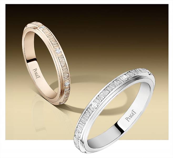 피아제, 포제션 링 2.8mm | 화이트 골드와 로즈 골드 두 가지 버전으로 새롭게 공개된 ‘포제션 링’은 슬림한 2.8mm 디자인으로, 포제션 특유의 우아한 실루엣을 더욱 섬세하게 표현한다. 피아제의 시그니처 장식 기법인 데코 팰리스가 더해진 링 표면은 빛을 섬세하게 반사하며 깊이 있는 광채를 만들어낸다. 솔리드 버전과 8개의 브릴리언트 컷 다이아몬드가 세팅된 버전으로 선보인다.