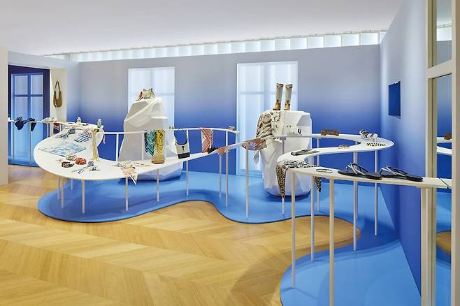 에르메스, 2026 봄/여름 오브제 프레젠테이션 | 에르메스의 2026년 봄/여름 오브제 프레젠테이션이 에르메스 메종 도산에서 진행했다. ‘미지의 세계로(Venture Beyond)’라는 테마 아래, 공간 자체를 하나의 탐험의 장으로 확장하며, 일상과 비일상의 경계를 넘나드는 초현실적 공간을 구현했다. 하늘과 바다가 맞닿은 수평선을 연상시키는 색조를 중심으로 클래식 제품을 선보인 존, 보다 깊고 몽환적인 블루로 한층 고조된 분위기를 연출한 이브닝 및 주얼리 존, 산뜻한 그린 팔레트로 연출한 홈 컬렉션 존으로 나뉘어, 올해의 테마를 제품과 시노그래피 전반에 걸쳐 몰입감 있게 표현했다.