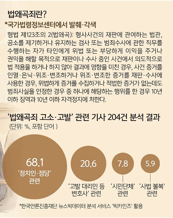 한국언론진흥재단의 뉴스빅데이터 분석 서비스 빅카인즈를 통해 ‘법왜곡죄 고소·고발’이 기사 제목과 본문에 언급된 기사 204건을 살펴본 결과 68.1%(139건)에 정치인이나 정당 관련 내용이 포함된 것으로 나타났다. 대상 기사 중 5.9%(12건)에는 정치적 불복 목적을 엿볼 수 있는 ‘반발’, ‘규탄’, ‘편향’, ‘불복’, ‘정치판사’ 같은 단어가 들어가 있는 것으로 파악됐다.