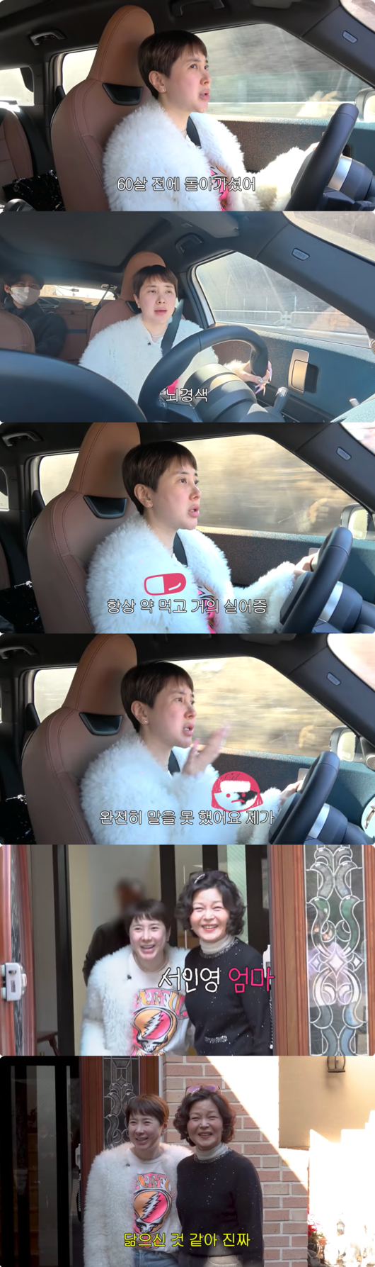 서인영은 뇌경색으로 일찍 세상을 떠난 친어머니를 회상했다. 서인영은 “친엄마를 제가 케어했죠. 60살 전에 돌아가셨어. 뇌경색”이라며, 당시 어머니가 뇌경색으로 쓰러진 후 정신은 있었지만 눈을 뜨지 못했던 안타까운 상황을 전했다.