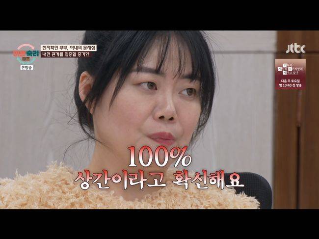 특히 아내는 "남편이 학교 다닐 때 화상 수업을 했다. 그때 좋아했던 여자의 영상을 갖고 있더라"라고 말했다. ‘친자확인’ 부부 남편은 “좋아했던 여자가 있었지만, 그 여자랑 같이 하는 수업 때문에 친구가 찍어서 보내준 영상이다. 지웠다”라고 말했다.