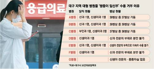 9일 추경호 국민의힘 의원실이 대구시 보건의료정책과에서 제출받은 자료에 따르면 해당 임신부는 응급차가 도착한 이후 대구 관내 7개 병원에 수용을 요청했지만 모두 거절당했다. 수용을 거절한 이유는 여유 병상이나 인공호흡기, 산과·신생아과 전문의가 부족하기 때문이었던 것으로 나타났다. 추경호 의원은 “실제로 대구에서 수용을 거부한 7개 병원은 대부분 산과·신생아과 전문의가 1~2명에 불과한 것으로 파악됐다”고 말했다.
