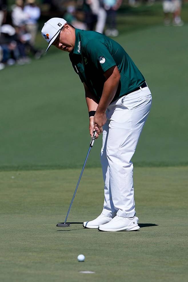 [오거스타=AP/뉴시스] 임성재가 9일(현지 시간) 미 조지아주 오거스타 내셔널 골프클럽에서 열린 미국프로골프(PGA) 투어 제90회 마스터스 토너먼트 첫날 2번 홀에서 퍼트 미스를 범한 후 아쉬워하고 있다. 임성재는 4오버파 76타 공동 56위권으로 1라운드를 마쳤다. 2026.04.10.