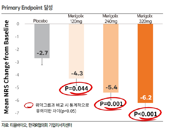 메리골릭스는 유럽 6개국에서 진행된 자궁내막증 대상 임상 2a상의 86명 결과는 압도적이다. 메리골릭스는 12주 투여 후 통증(NRS 점수)은 위약군 대비 모든 용량군에서 통계적으로 유의하게 감소했다. 특히 고용량군에서는 평균 약 6점 이상의 통증 감소가 나타났다.