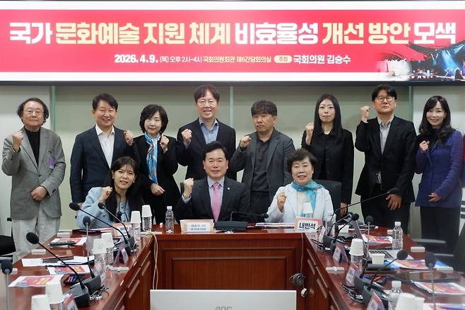국회 문화체육관광위원회 소속 김승수 의원(국민의힘, 대구 북구을,사진 앞줄 중앙)이 9일 국회의원회관 제6간담회의실에서 국가 문화예술 지원체계 비효율성 개선방안 모색 토론회를 개최했다.