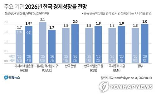 (서울=연합뉴스) 김민지 기자 = 아시아개발은행(ADB)은 중동 갈등이 한 달 안에 조기 안정화된다는 가정으로 올해 한국 경제가 1.9% 성장할 것으로 전망했다.