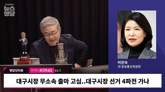 ◆ 장성철 : 장성철의 뉴스명당 2부 <명당 인터뷰>에서는요, 국민의힘 대구시장 컷오프 후 무소속으로 나가겠다며 열띤 행보를 펼치고 계시는 분입니다. 이진숙 전 방통위원장 전화로 연결되어 있습니다. 위원장님, 나와 계시죠?