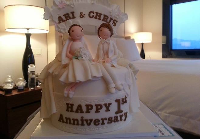 ▲ 우리 부부의 영어 이름이 적힌 결혼 1주년 기념 케이크. Ari와 Chris의 첫 자를 따서, 우리 둘이 함께 구성한 가족의 이름을 만들었다. 아콘네(Acorne)라고. (크리스 제공 사진) |