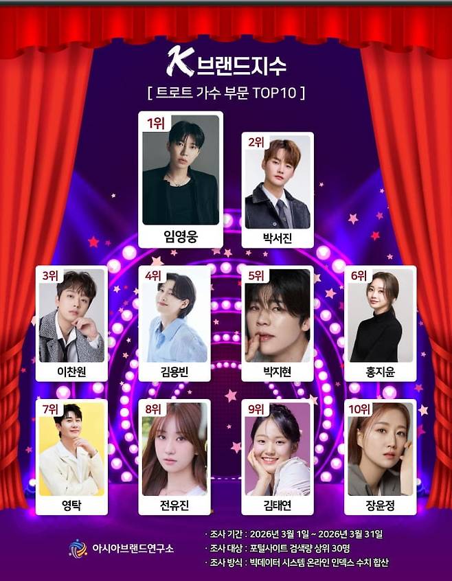 류원선 아시아브랜드연구소 리서치센터장은 "흔들림 없이 1위에 등극한 임영웅은 세대를 아우르는 압도적인 인지도와 긍정적인 미디어 평가를 바탕으로 최정상의 자리를 유지하고 있다"고 분석했다.