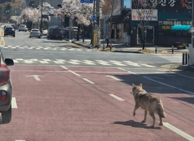 도로 한가운데 서 있는 커다란 늑대 한 마리. 바로 옆엔 신호를 기다리는 차량들도 있습니다.