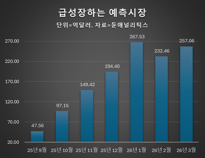 10일 듄애널리틱스에 따르면 지난달 예측시장의 명목 거래대금은 257억552만달러를 기록했다.