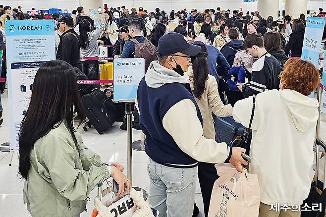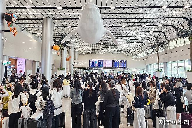 기상악화로 차질을 빚은 항공기 운항이 재개되면서 제주를 빠져나가려는 체류객과 방문객들이 맞물려 제주국제공항이 문전성시를 이루고 있다.