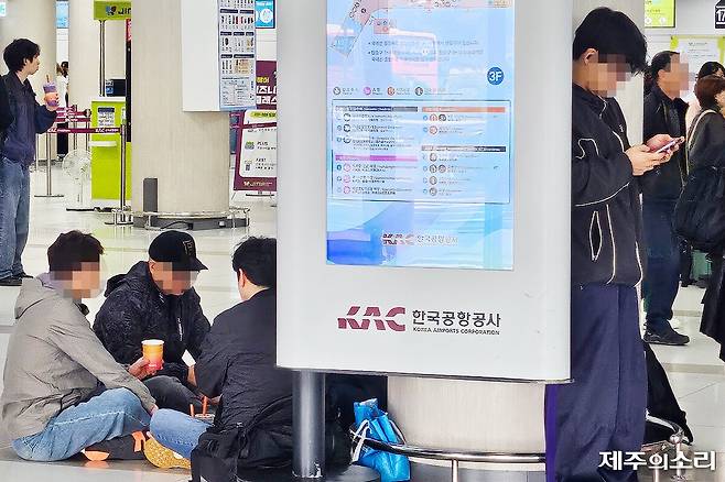 체류객이 몰리면서 공항 휴게 시설은 만석이다. 자리를 찾지 못한 일부 승객들은 공항 바닥에 앉아 식사를 하며 항공기 재개 여부를 기다리고 있다.