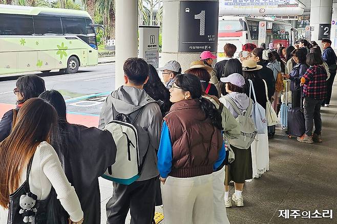 제주로 향하는 항공편도 밀려들면서 1층 여객터미널도 인산인해다. 버스 승강장에는 노선 별로 수십 명의 대기 줄이 만들어졌다.