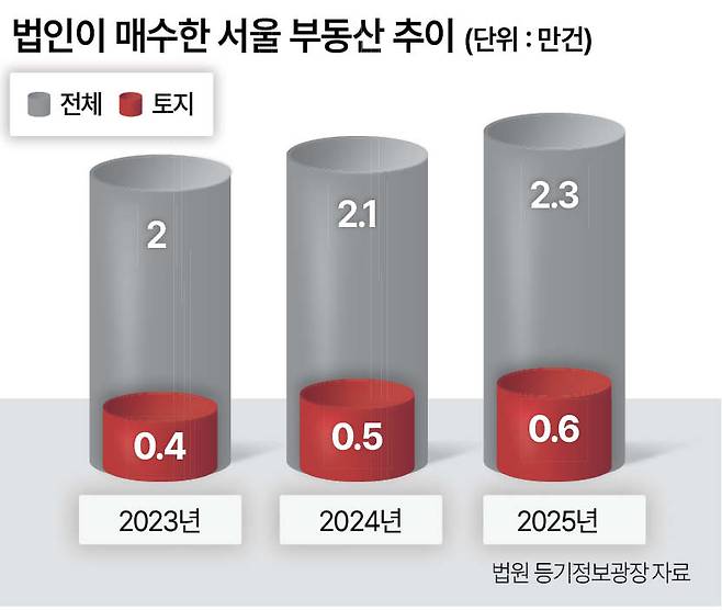 10일 법원 등기정보광장에 따르면 지난해 법인이 서울 부동산(토지·건물·집합건물 등)을 매수한 건수는 2만3082건인 것으로 집계됐다. 최근 3년간 추이를 보면 2023년 2만225건→2024년 2만1314건→지난해 2만3082건 등으로 증가세를 보이고 있다. 다만 법인에는 비영리법인도 포함돼있기 때문에 모두를 ‘기업’으로 볼 순 없다.