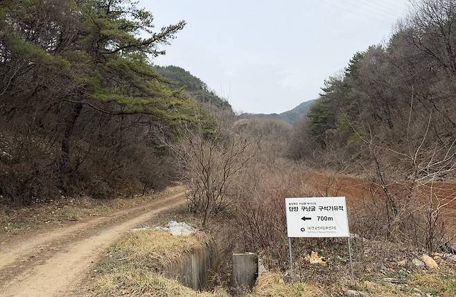 | ▲ 단양 구낭굴 구석기 유적 표지석 비포장 길을 따라 700m 더 들어가야 한다. |