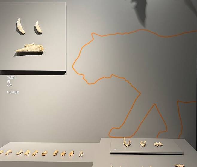 | ▲ 구낭굴유적 호랑이뼈 전경 송곳니 2점, 아래턱뼈 1점, 발가락뼈 10점이 전시되어 있다. |