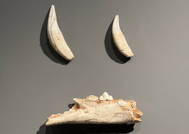 | ▲ 호랑이 송곳니와 아래턱뼈 단양 구낭굴 구석기유적에서 출토된 호랑이뼈 |