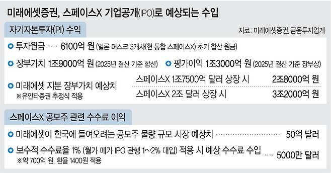 미래에셋증권은 일론 머스크 관련 투자로 이미 1조3000억 원의 평가이익을 거둔 데다 상장 시 관련 지분가치가 최대 3조2000억 원까지 뛸 수 있다는 계산도 나오고 있다.