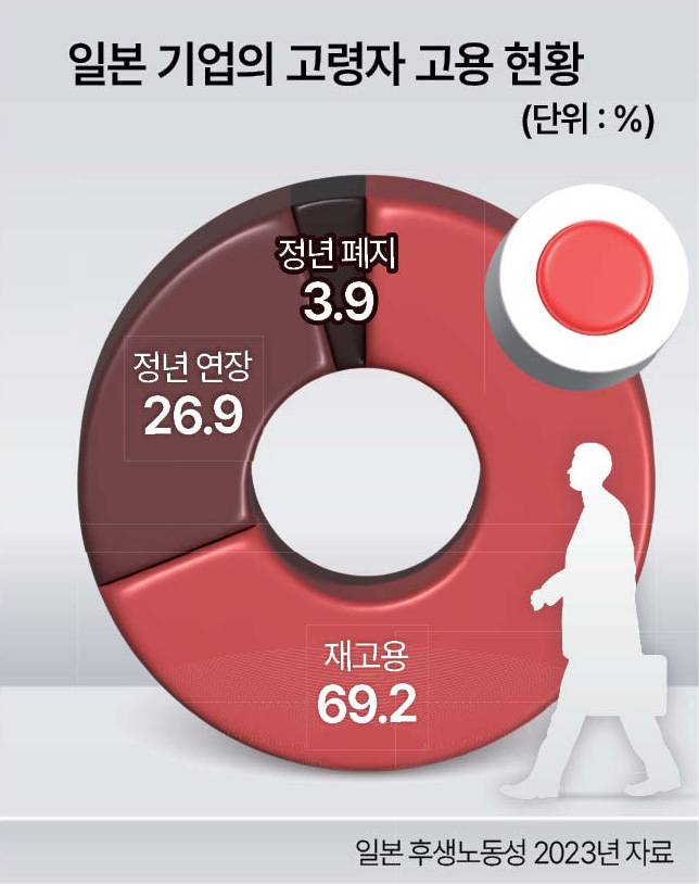 한국보다 앞서 고령자 고용연장 방안을 논의한 일본은 재고용 제도를 활용해 연금 수령 개시 연령과 퇴직 간의 소득 공백 문제를 해결해 왔다. 일본은 2000년 기업에 65세까지 고령자 고용 확보 조치 노력을 의무화하며, 그 방안으로 재고용과 정년연장, 정년폐지 중 하나를 선택할 수 있도록 했다. 가장 많은 기업이 선택하고 있는 것은 재고용 방식이다. 지난 2023년 후생노동성의 조사에 따르면 전체의 69.2%가 재고용 방식을 채택한 것으로 나타났다. 정년연장과 정년 폐지는 각각 26.0%, 3.9%로 집계됐다.