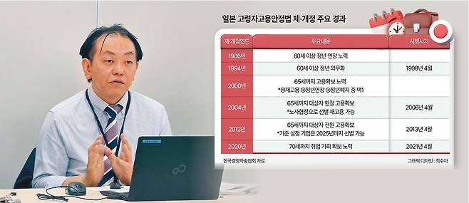 ▶日, 기업 자율 맡긴 재고용…청년·고령층 모두 지켰다=지난달 27일 일본 도쿄에서 만난 시노하라 츠요시 일본 후생노동성 직업안정국 고령자고용대책과 과장보좌는 “정부가 정년을 일률적으로 정하지 않는 것은 노사의 합의를 존중한다는 의미”라며 “여전히 정년을 65세로 연장하는 것보다 현재의 고령자 고용 정책을 유지하는 것이 바람직하다고 판단하고 있다”고 말했다.