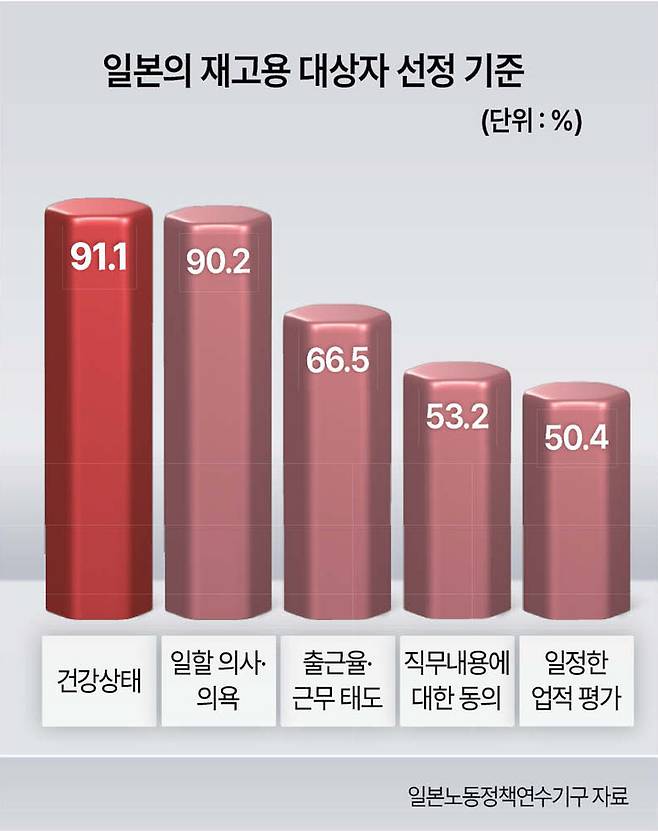 일본노동정책연수기구에 따르면 일본의 재고용 대상자 선정 기준을 조사한 결과 ▷건강상 지장이 없을 것(91.1%) ▷일할 의사·의욕이 있을 것(90.2%) ▷출근율·근무태도(66.5%) 순으로 합리적인 수준에 그쳤다.