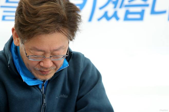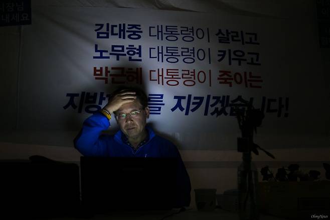 | ▲ 단식 다섯번째 밤 맞는 이재명 지방재정 개편안 철회를 촉구하며 이재명 성남시장이 무기한 단식투쟁을 시작한지 5일째인 2016년 6월 11일 오후 서울 광화문광장에 마련된 농성장에서 일과를 마치고 하루를 정리하고 있다. |