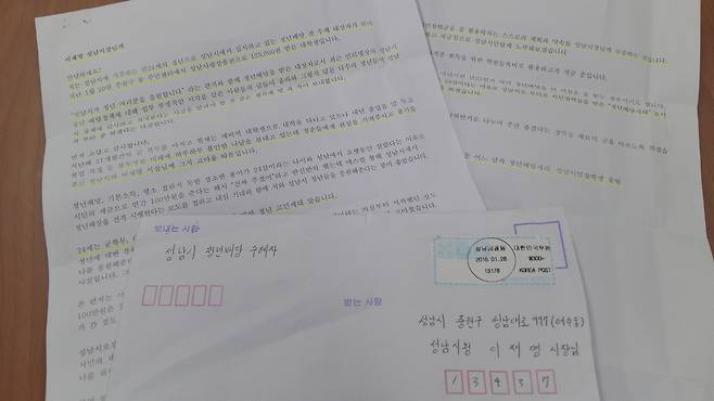 | ▲ 2016년 당시 이재명 성남시장이 관철시킨 '청년배당'의 수혜를 입었다는 청년이 성남시에 보낸 편지. |