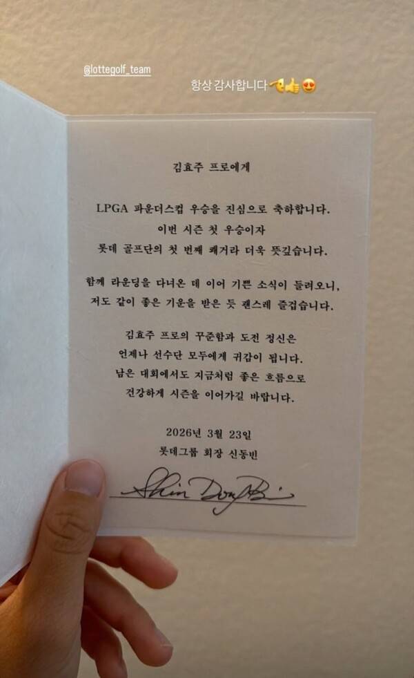 김효주는 지난 9일 자신의 소셜미디어(SNS) 계정을 통해 롯데그룹 신동빈 회장으로부터 받은 편지를 공개했다.