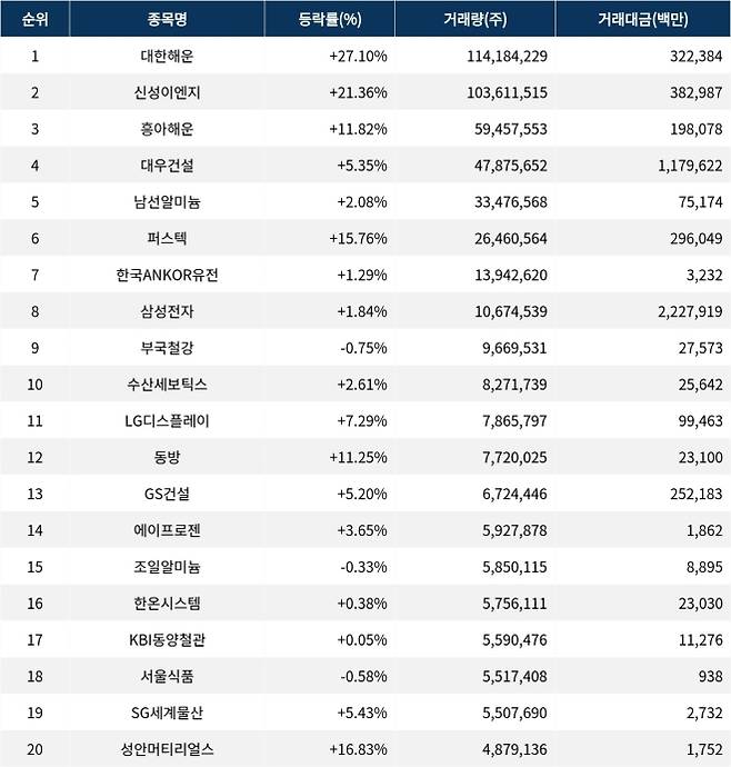 한편 거래량 상위 20위권 종목들은 LG디스플레이(034220) ▲7.29%, 동방(004140) ▲11.25%, GS건설(006360) ▲5.20%, 에이프로젠(007460) ▲3.65%, 조일알미늄(018470) ▼0.33%, 한온시스템(018880) ▲0.38%, KBI동양철관(008970) ▲0.05%, 서울식품(004410) ▼0.58%, SG세계물산(004060) ▲5.43%, 성안머티리얼스(011300) ▲16.83% 등의 성적을 기록하고 있다.