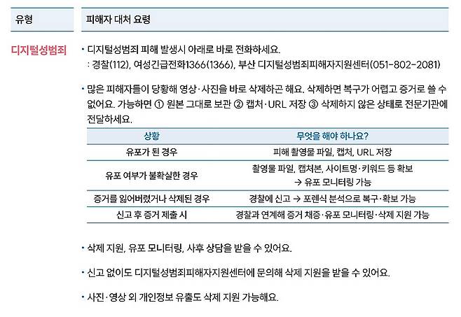 매뉴얼을 살펴봤습니다. '대처방법 자세히 보기'를 통해 유형별 대응 주요 포인트가 매뉴얼 첫머리로 제시돼있었습니다. 보다 자세한 내용들을 ▲상담 지원 ▲시설보호·주거지원 ▲의료·심리치료 지원 ▲법률지원 ▲신변보호 ▲수사지원·형사절차상보호 ▲경제지원 ▲디지털 피해 영상물 삭제 지원, 그리고 ▲고소장 작성 방법 순으로 전하고 있었습니다.
