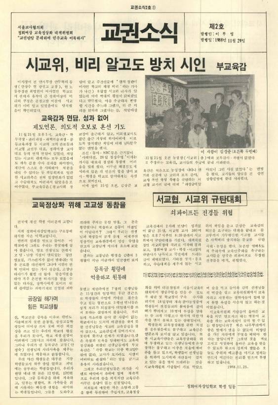 투쟁이 절정에 달한 것은 1988년 겨울방학이었다. 학생들은 학교 울타리를 넘어 '서울시 교육위원회(현 서울시교육청)' 점거라는 대담한 결정을 내렸다.