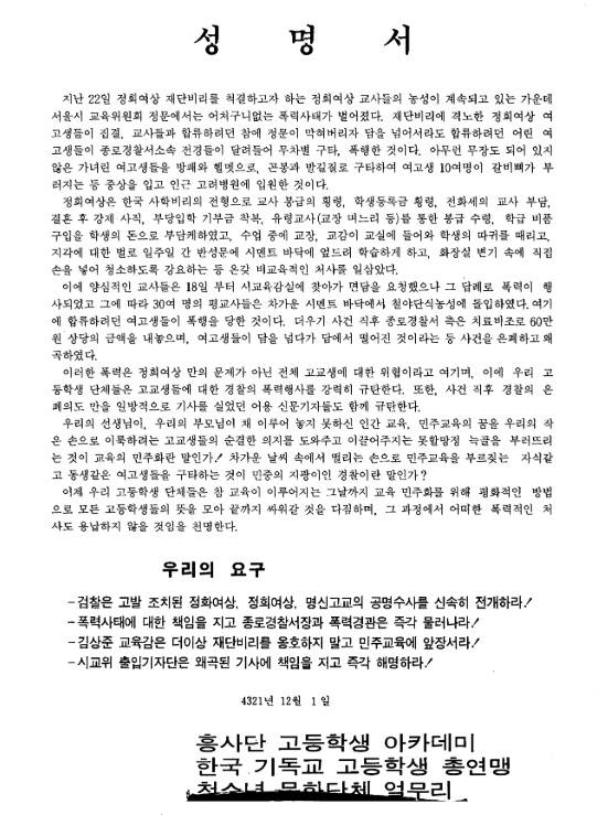 | ▲ 정희여자상업고등학생들의 성명서 교권소식에 실린 성명서 |