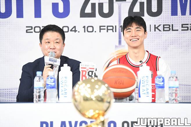 KBL은 10일 KBL 센터 5층 교육장에서 2025-2026 LG전자 프로농구 플레이오프 미디어데이를 개최했다. 2위로 정규리그를 마친 안양 정관장은 유도훈 감독과 박지훈이 대표 선수로 참석해 미디어데이를 빛냈다.